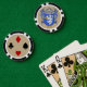 Spanish surname Ruiz historical arms set on a mottled parchment style background. The reverse of the chip has the symbols for the four suits of cards; a black spade, a red heart, a red diamond, and a black club on the same parchment style background.