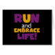 If you love to run, run 5Ks, 10Ks, half marathons, or marathons, you'll love this colourful text design in purple and yellow that reads Run and Embrace Life! Run and Embrace Life T-shirts, hoodies, magnets, buttons, cards, stickers, key chains, and lots of other items for runners who love a bright, colourful running design!