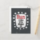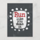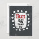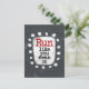 A cute typographic design that says "Run Like You Mean It". It features black and red text on a white rectangle with funky, playful white dots surrounding it, all on a grey background.