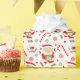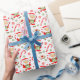 Creative running track and field Christmas holiday gift wrap featuring Mrs. Claus runner racing, surrounded by holiday candy and cookies.