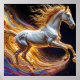 A stunning representation of a galloping horse with flowing golden mane surrounded by vibrant abstract elements, conveying the speed, power, and beauty of equestrian elegance and artistic design.