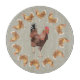 This cutting board features a border of strutting brown hens with a central rooster. A colourful accessory for the kitchen.