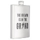 The product is a good size and came exactly as it was pictured. The lid is not attached to the flask, which could be dangerous on drunken nights... The print came out surprisingly well and looks very sharp. Would definitely recommend.
