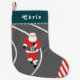 Creative running track & field Christmas stocking featuring Santa runner racing. Edit text to add name.