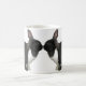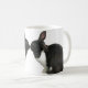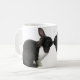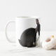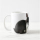 A beautiful charcoal and white bunny facing his mirror image on an 11 ounce mug.