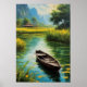 Capture the rustic allure of countryside tranquillity with a captivating poster. A charming swampy lake unfolds, its calm waters cradling a small wooden boat. In the distance, a quaint wooden house stands as a beacon of simplicity. Majestic mountains grace the horizon, adding a touch of grandeur. This poster captures the harmony of nature and human touch in a serene countryside scene.