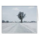Snowy country road in Sweden on a cold winter day. Big tree next to the road and a little village in distance. Photography.