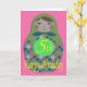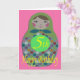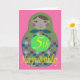 5th Birthday card with an image of a classic shaped Russian Doll with colored circles, on a pink background.
