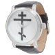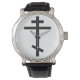 The Russian Orthodox Cross (or just the Orthodox Cross by some Russian Orthodox traditions) is a variation of the Christian cross since the 16th century in Russia, although it bears some similarity to a cross with a bottom crossbeam slanted the other way (upwards) found since the 6th century in the Byzantine Empire. The Russian Orthodox cross has three horizontal crossbeams, with the lowest one slanted downwards. Nowadays it is a symbol of the Russian Orthodox Church and a distinctive feature of the cultural landscape of Russia. Other names for the symbol include the Russian cross, and Slavonic or Suppedaneum cross.