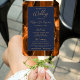This elegant wedding program fan features a burnt orange agate background trimmed with gold faux glitter. The text appears in modern gold-coloured handwriting and sans serif fonts on a dark navy blue rectangle.
