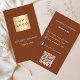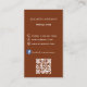 A rust, burnt orange coloured background. Personalise and add your business logo,name, title and contact information. Add your website url/link to the Qr code. With Facebook icon. White text.
