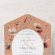 AVAILABLE WITH OR WITHOUT QR CODE. This design features a soft wildflower frame of rust, gold, brown, and peach flowers around a white oval on a soft rust burnt orange background. Add a QR code to your invitation so that gusts can quickly access your wedding Website for details, directions, menu options, and more, or add your gift registry Web URL. Personalized All-In-One invitations are a unique combination of both a beautifully printed custom invitation with an easy to tear off perforated RSVP postcard. And they are so easy to use! You simply fold, then seal the back flap with the three included clear stickers, and mail. And when your guests receive your custom invite, they just tear the perforated RSVP Card off and drop it back in the mail to you! Created by Simply Farmhouse Press.