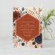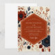 This design features a warm, autumnal palette with rich rust tones and deep navy blue accents. Intricate floral illustrations and botanical elements create a romantic and rustic atmosphere, perfect for a harvest-themed celebration. The artwork evokes a sense of natural beauty and vintage charm.