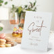 Direct guests to your dessert table or candy bar with this simple pedestal sign featuring "Love is sweet, please take a treat" in elegant handwritten script and classic serif lettering. Colorway: Rust, a warm earth tone terracotta.