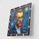 This image presents a vibrant and expressive artwork featuring a portrait of a man with fiery red hair and beard, and striking blue eyes. He is depicted wearing a dark blue coat over a white collared shirt. The background is a swirling, textured night sky filled with luminous yellow stars and celestial bodies, evoking a sense of cosmic wonder and artistic energy. The golden-yellow field below completes the setting. Overlaid on this captivating scene, white handwritten-style text reads "Dear GOD" in the upper left and "I trust You!" in the lower right. The piece beautifully combines a distinct artistic style with a profound message of faith.