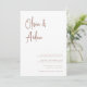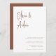 A beautiful typography based wedding invitation featuring your names in modern terracotta rust handwritten script lettering at the top. Personalise with your wedding details in classic serif lettering aligned at the lower right.