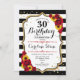 30th Birthday Invitation. Elegant design with sunflowers, red roses, faux glitter gold and black & white stripes. Features stylish script font and confetti. Perfect for an elegant birthday party. Customize with your own details.