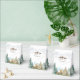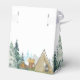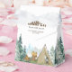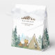 This fun rustic birthday favour box has a wood panelled "CAMPER" and script font. The bottom has a watercolor forest, mountains and scenery. It is finished by the tan, green and brown camping items which include a tent and fire.