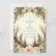 A rustic woodland wedding design featuring deer antlers, soft blush roses, ferns, and greenery. The natural elements and earthy tones create a romantic yet rugged atmosphere, perfect for boho, forest, or country-themed weddings.