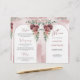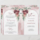 The elegant boho arch watercolor blush and burgundy roses with eucalyptus greenery and gold sparkles create a romantic and sophisticated atmosphere for a wedding ceremony. The folded program featuring these elements adds a touch of beauty and elegance to the event, setting the tone for a memorable celebration.