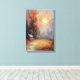 This AI-generated landscape artwork stretched canvas art print captures the serene beauty of autumn in the countryside. A rustic cabin nestles among towering trees, their leaves a blend of warm oranges, reds, and browns, reflecting the rich tones of fall. The glowing sun casts a soft, golden light over the peaceful setting, creating a tranquil and nostalgic atmosphere. The brushstroke-inspired texture gives this piece an impressionistic feel, perfect for those who appreciate rustic or nature-inspired home decor. This artwork evokes the quiet charm of an autumn morning, ideal for cosy living spaces, cabins, or any room that needs a touch of warmth and nature. The hazy background adds depth to the scene, while the soft lighting highlights the natural beauty of the season. It's a timeless fall landscape that brings the calming essence of the outdoors into your home.
