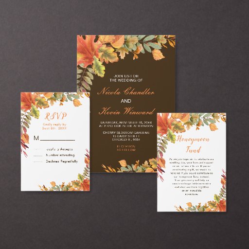 Pretty wedding rsvp card with autumn fall leaves in orange, yellow and green. Perfect for an autumn fall wedding. The words can be changed to suit your own details or requirements.