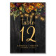 Rustic country elegant wedding table number with editable text featuring fall botanicals and a chic script on a dark brown barn wood background with string lights. Ideal for your summer or autumn fall garden backyard outdoor or farmhouse wedding.