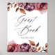 Rustic floral wedding guest book sign featuring watercolor fall flowers and foliage in shades of marsala, burgundy, purple, brown, and rust-orange. The elegant fall floral design is complimented by a modern calligraphy script. Personalise the wedding guest book sign with your custom text. The autumn floral wedding guest book sign is perfect for your fall wedding or special event. Designed to coordinate with our Rustic Autumn Floral wedding collection.