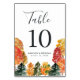 Add a personalised touch to your fall wedding Rustic Autumn Forest wedding table number cards. The autumn wedding table number cards feature the table number, names, and wedding date framed by a border of watercolor trees in shades of yellow, orange, burgundy, rust, and green. The design repeats on the back. The table number cards are designed to coordinate with our Rustic Autumn Forest wedding collection.