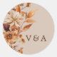 Rustic Autumn Leaves Monogrammed Sticker. Showcase your initials in seasonal style with this monogrammed round sticker, adorned with hand-painted autumn leaves in rich terracotta and burnt orange, surrounded by soft beige dahlias and copper-toned roses. The elegant taupe backdrop makes your monogram stand out with timeless beauty, making this the perfect detail to enhance favour bags, envelopes, or décor. Add a personal touch that ties everything together—customise your signature look today.