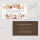 Elegant, floral business cards featuring a top and bottom border of watercolor flowers, succulents, and leaves in rustic shades of orange, peach, blush pink, ivory, brown, and green. Personalise the front of the watercolor floral business card by adding your name & job title. The feminine business card reverses to feature your business details such as address, website, and email address a solid dark brown background. The perfect business card for event planners, wedding planners, florists, bloggers, & more!