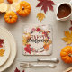 This customisable Thanksgiving paper coaster features a stunning vine wreath design, a vivid tableau of autumn's finest elements. The centerpiece is a rich mix of seasonal abundance: deep burgundy berries, crisp red maple leaves, vibrant gold and orange foliage, and delicate sprays of dried wheat. The artwork is layered over a warm, vintage kraft paper texture, lending an authentic, rustic feel. Bold text announces "HAPPY Thanksgiving" in a sophisticated font pairing, with a clean arc below ready for personalisation with your family name or message.