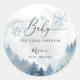 Rustic baby shower favour sticker featuring watercolor illustration of a snowy mountain with pine tree forest and blue snowflakes. The text says "baby it's cold outside."