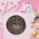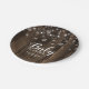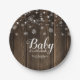 Rustic winter themed baby shower paper plates. This trendy design features string lights and snowflakes on a dark wood background.