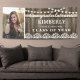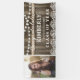 Rustic graduation party banner featuring a country barn oak barrel background, a photo of the graduate, twinkle string lights, babys breath, a text template for you to personalize.