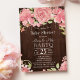 Rustic country style couple baby shower backyard barbecue invitation on dark brown barn wood featuring big pink watercolor peony roses and strings of twinkle lights. +++++++++++++++ The invitation is suitable for outdoor garden backyard rustic country bbq parties.