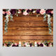 An extra large 54 by 40 inch poster board with a rustic vintage reclaimed barn board wood background. A bough of deep burgundy and blush pink florals cascade amongst silver greenery garlands and romantic candle-lit floral bouquets bursting with peony flowers and sprays of floral artistry. This poster is blank so that you may enter your text and use it for any occasion.