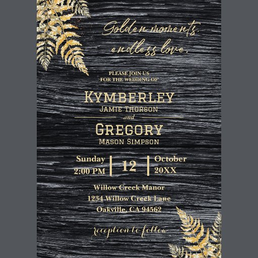 Our "Golden Moments, Endless Love" collection now includes this elegant RSVP card, perfect for your fall wedding celebration. The design features a dark grey weathered barn wall background and stunning gold fern accents, bringing just the right amount of nature to your special day. The minimalist and rustic country style pairs perfectly with any barn or outdoor themed wedding. The chic calligraphy and informal script add a touch of modern elegance, while the botanical elements provide a natural and timeless touch. Our "Golden moments, endless love" theme perfectly captures the essence of your special day, and this RSVP card is sure to impress your guests with its stylish and romantic design. Ideal for the couple who desires simple romantic charm on their big day.