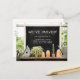 Announce your new home address to friends, family and associates with this charming rustic moving announcement post card. It features a chalkboard with custom text that you can personalise with your new home address. The chalkboard sits above a potting shelf with houseplants, a birdhouse and clay pots along with a plant watering can. The look is rustic farmhouse style with a gardening theme. There is also a text template on the back of the card for personalising with your desired message.