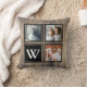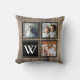 Rustic farmhouse barn wood background with 3 family photo slots, black frames, and a monogram letter in white. The backside of the pillow has barn wood and black deer antlers with a monogram letter.