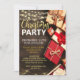 Elegant and rustic Christmas party invitation with sparkly string lights and wrapped gifts on a barn wood background.