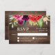 A charming rustic wedding RSVP card design with a rich barn wood background embellished with a rustic mixed floral arrangement in russet orange, deep pink, burgundy roses with mixed wildflowers and greenery. The look gives a casual boho style that is also tasteful and classic. It's a perfect choice for a barn or ranch wedding, country estate wedding, or a rustic winery wedding. Personalise the response date with your required RSVP date. These RSVP cards come with plain white envelopes.