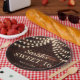 Sweet 16 custom birthday party paper plates with a rustic dark brown barn wood background and twinkling string lights. Personalised with the name of the guest of honour and her party date.
