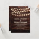 Wedding invitation with a rustic dark brown barn wood background and twinkling string lights