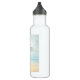 Water bottle with a beautiful rustic image. Subtle colours of light blue, sandy brown and gentle white. A beach scene with a boat on the shore and a faded lighthouse off in the distance with birds flying around. An elegant shabby look.
