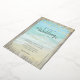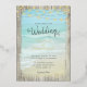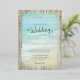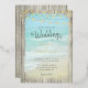 Beautiful aqua blue ocean waves crash against the beach in this beach wedding design framed with rustic weathered wood, with the added elegance of real gold foil accents on the string lights and the names of the wedding couple. These wedding invitations are perfect for destination weddings, as well as any beach and coastal themed wedding.