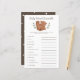 Cute bear theme baby shower baby word scramble card featuring illustration of a cub. The list of words on this card are all related to babies and they are scrambled. The guests are going to compete who can unscramble all of them first! ANSWER KEY: 1. car seat 2. milk 3. playpen 4. pacifier 5. diaper 6. rocking chair 7. nursery 8. baby monitor 9. swaddle 10. formula 11. rubber ducky 12. stroller.
