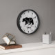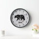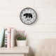 This clock features a black bear with an arrow over a faux wood plank background for a rustic farmhouse look