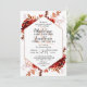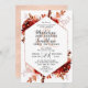 Rustic Beauty Floral Framed Watercolor Bohemian Autumn or Fall Design with Boho Hand Painted Flowers, feathers, and Plenty of colourful orange, rust, red, Burgundy, Marsala, and peach leaves and foliage. With Hand Drawn Line elements, Swirly Hand Lettered Fonts, Rose Gold Glitter Foil and Paint Brush Strokes on a Geometric Hexagon Frame Wedding invitations!