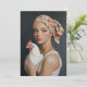 A young woman with striking blue eyes and delicate features gazes softly while holding a white chicken. She wears a floral headscarf tied around her head, evoking a rustic and vintage aesthetic. The dark background contrasts with her fair complexion and the white feathers of the chicken, creating a timeless, classical portrait with a painterly effect.